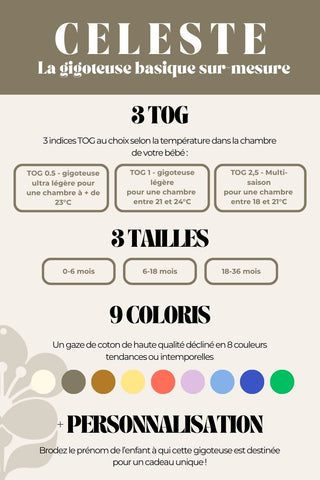 Le TOG est une unité de mesure de l'isolation thermique. Il s'agit d'une unité de surface, appelée également "résistance thermique". Elle est utilisée dans l'industrie textile et est souvent mentionnée, par exemple, sur les couettes et les gigoteuses. Il est important de choisir sa gigoteuse ou sa couverture (lorsque votre enfant sera plus grand) avec un TOG adapté à la température de la pièce dans laquelle votre bébé dort.
