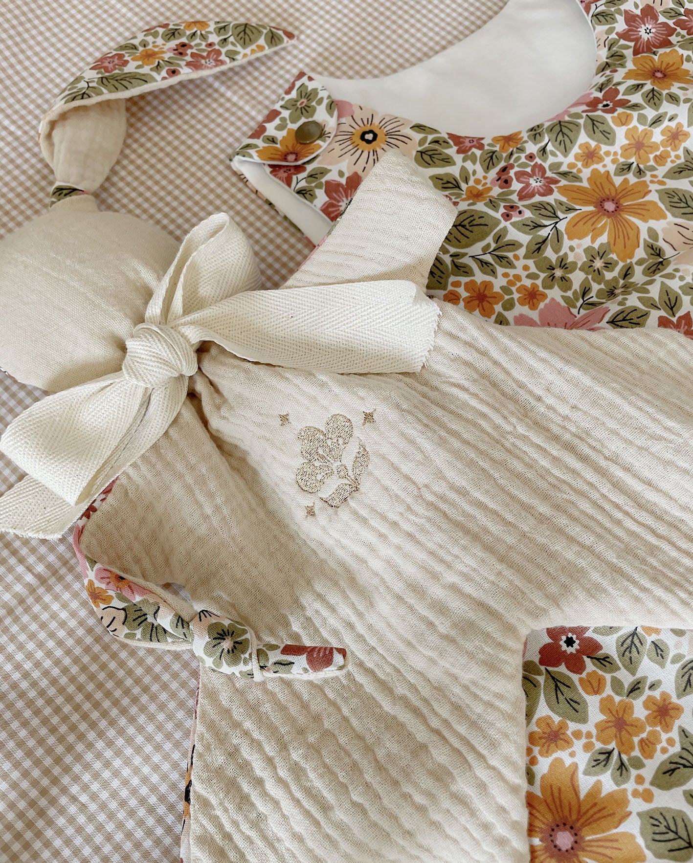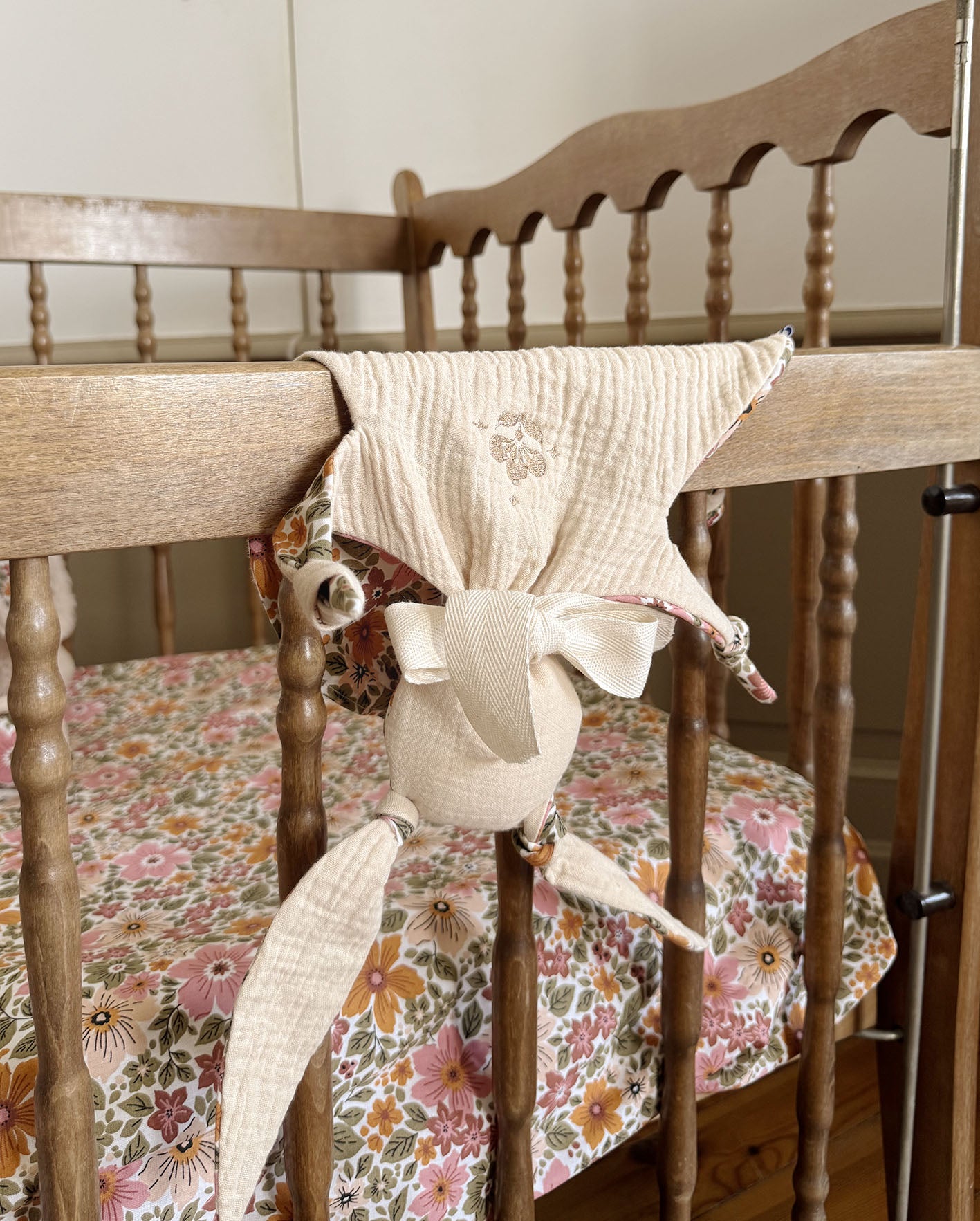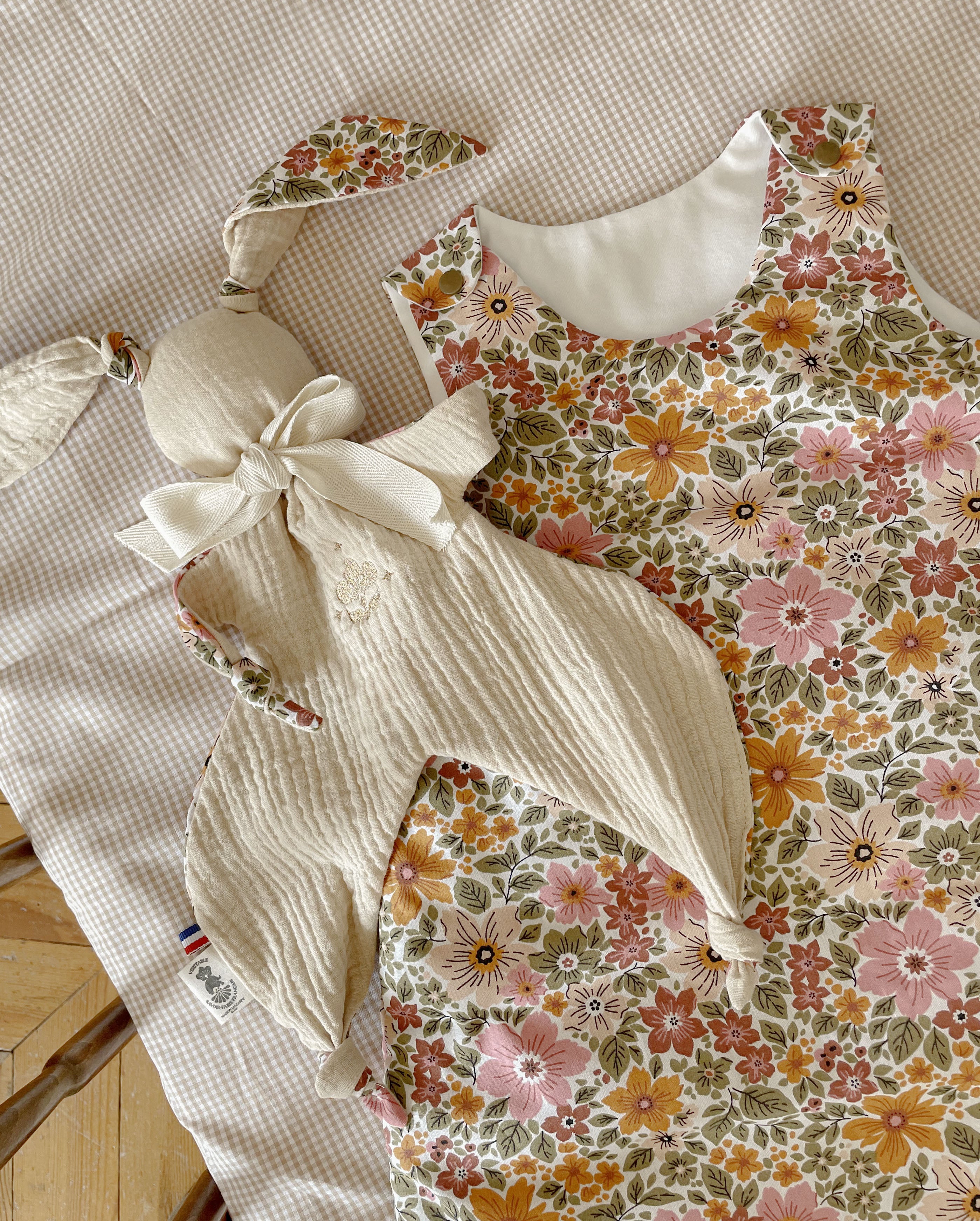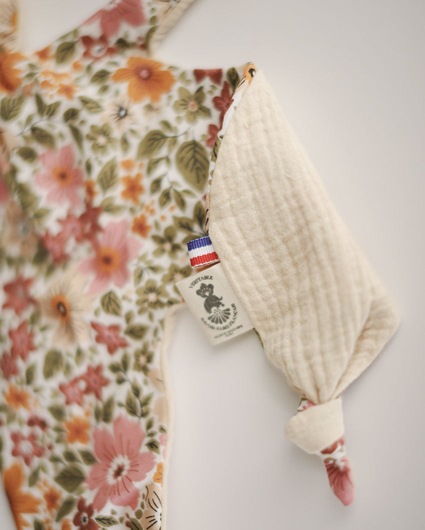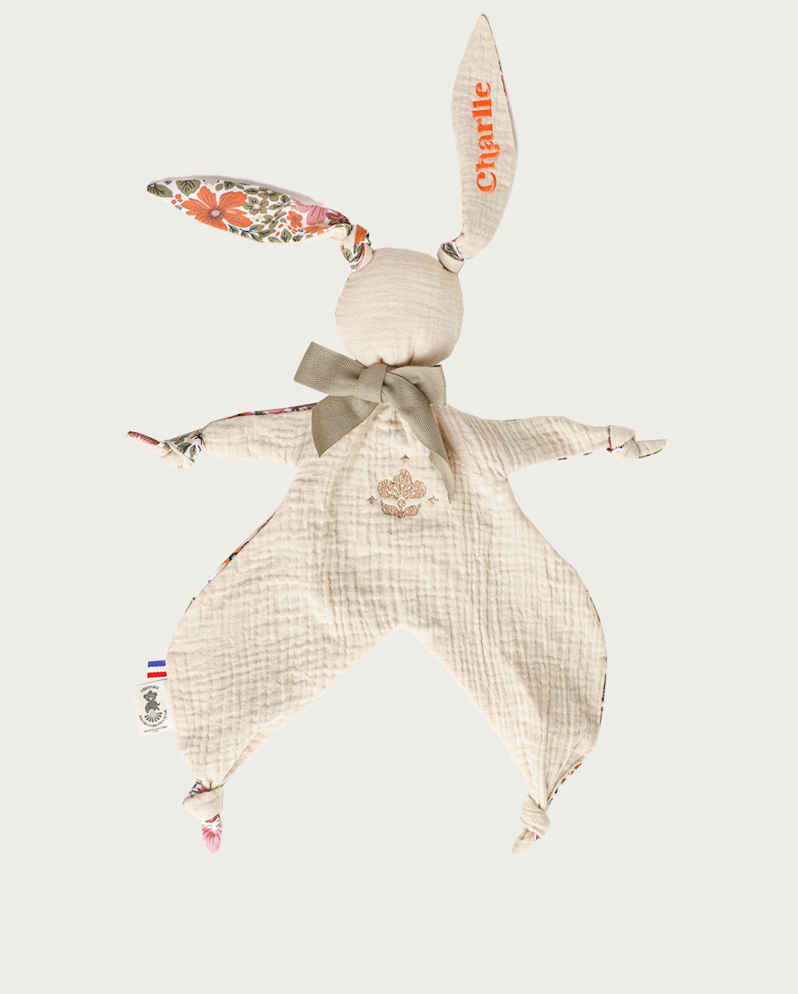 Doudou lapin réconfort bébé naissance gaze de coton et fleurs